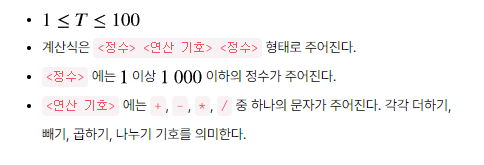 - 숫자 연산자 숫자 형태의 문자열이 T개 주어진다.